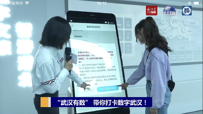 湖北廣電主播與法國在漢留學(xué)生來到鄂旅投集團數(shù)字展廳詳細了解了“一部手機游湖北”項目亮點及核心功能,并現(xiàn)場體驗文旅場所分時預(yù)約、門票酒店預(yù)訂、5G直播、智慧導(dǎo)覽等功能。