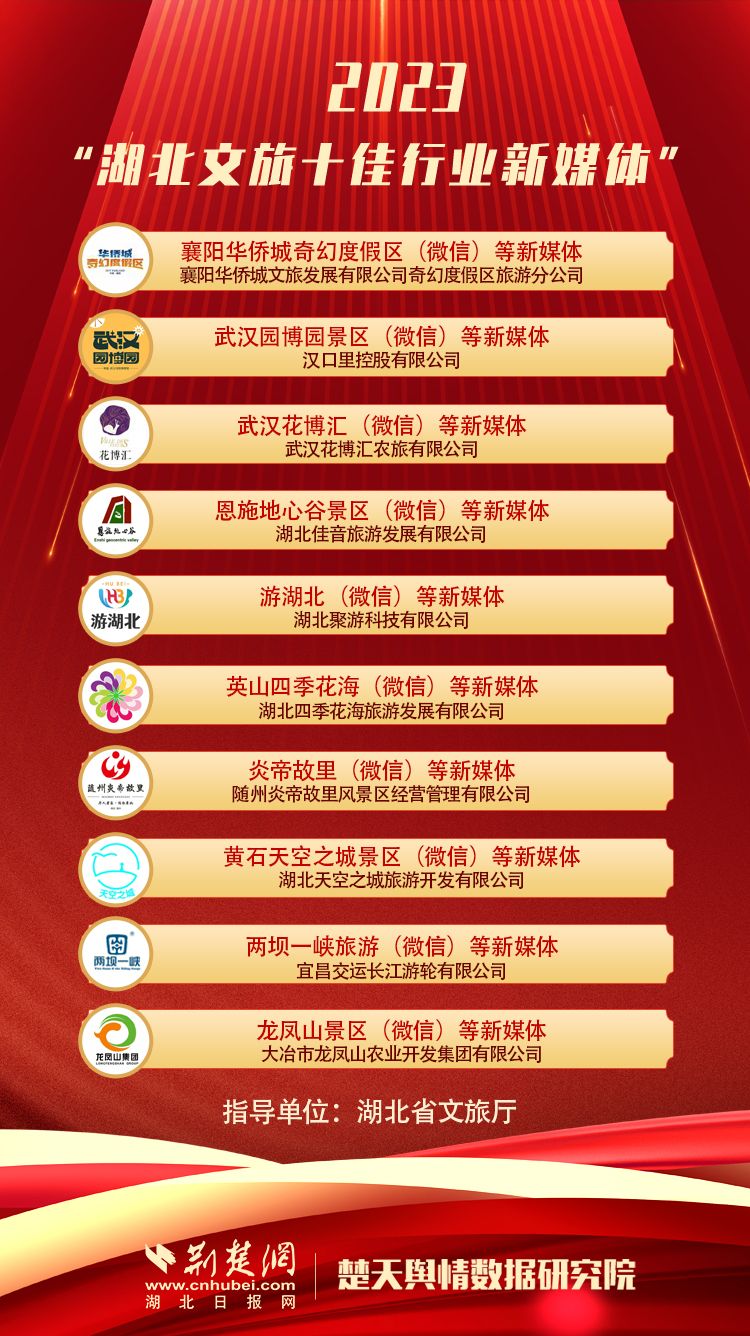 此次獲評2023“湖北文旅十佳行業(yè)新媒體”還有省內(nèi)襄陽華僑城奇幻度假區(qū)、漢口里、武漢花博匯、天空之城等9家單位。