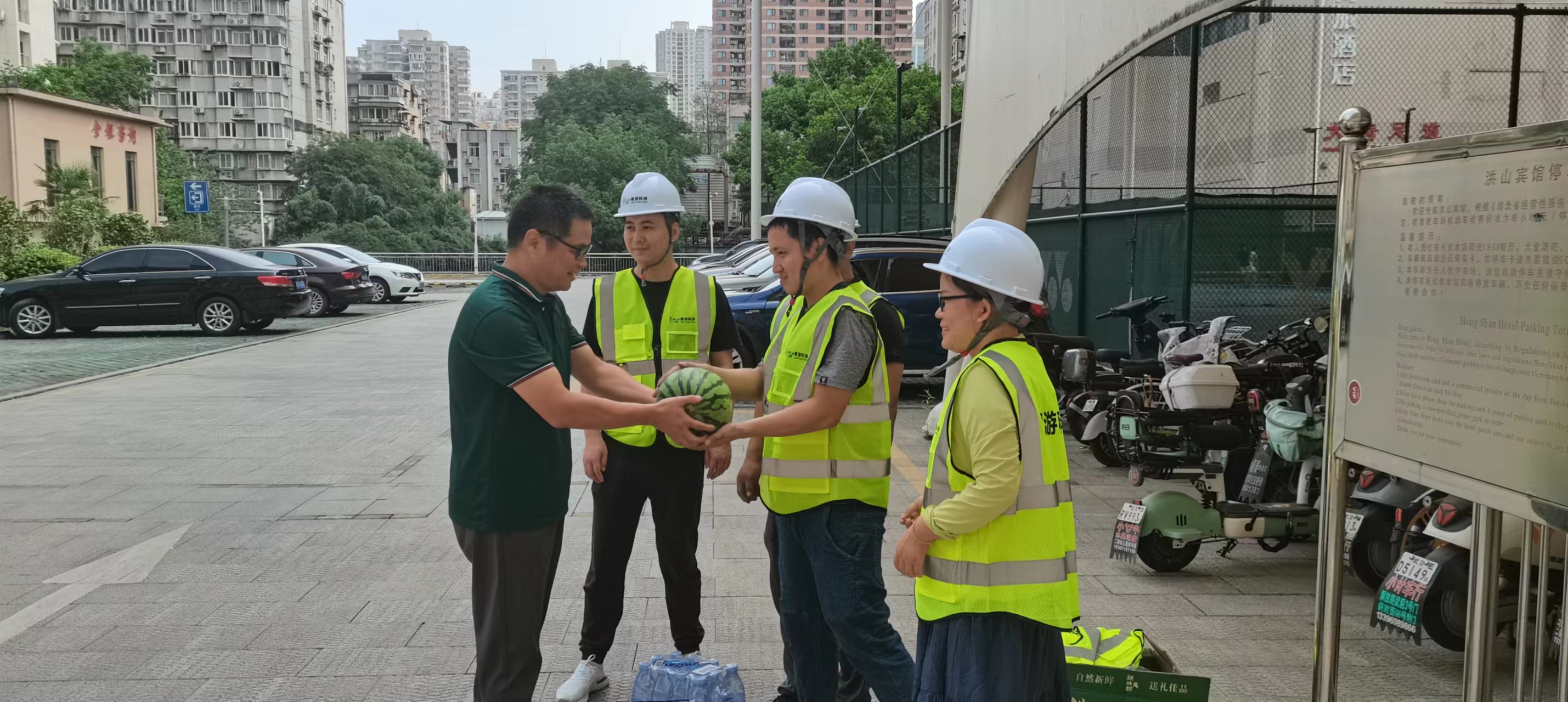 8月9日,數(shù)旅集團(tuán)工會“關(guān)愛職工 夏送清涼”活動(dòng)走進(jìn)洪山賓館項(xiàng)目施工現(xiàn)場,為項(xiàng)目工地一線員工送去工會的關(guān)懷,現(xiàn)場發(fā)放西瓜、涼茶等防暑降溫物品。慰問組肯定全體參建人員不怕吃苦、迎難而上、艱苦奮斗的精神,同時(shí)勉勵(lì)大家要把握良好發(fā)展機(jī)遇,筑牢安全發(fā)展底線,確保項(xiàng)目如期完成。
