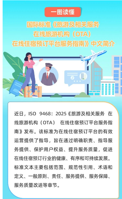 我國牽頭制定全球首個在線旅游機(jī)構(gòu)相關(guān)國際標(biāo)準(zhǔn),以“中國方案”推動全球旅游服務(wù)標(biāo)準(zhǔn)化進(jìn)程。近日,我國牽頭制定的《旅游及相關(guān)服務(wù)在線旅游機(jī)構(gòu)(OTA)在線住宿預(yù)訂平臺服務(wù)指南》(ISO9468:2025)國際標(biāo)準(zhǔn)正式發(fā)布。這是全球首個在線旅游機(jī)構(gòu)相關(guān)國際標(biāo)準(zhǔn),旨在規(guī)范全球在線住宿預(yù)訂平臺及其服務(wù),破解“大數(shù)據(jù)殺熟”“捆綁消費”“退改難”等痛點,構(gòu)建公平透明的消費生態(tài)?!吨改稀访鞔_了平臺方和住宿服務(wù)提供商的責(zé)任,規(guī)范了訂購、支付、退改、評價等環(huán)節(jié)的服務(wù)條款,提出了信息安全、財務(wù)安全和隱私保護(hù)等方面的服務(wù)保障要求。其發(fā)布是中國參與全球標(biāo)準(zhǔn)化工作的生動實踐,將推動全球旅游服務(wù)在標(biāo)準(zhǔn)化軌道上實現(xiàn)高質(zhì)量發(fā)展。