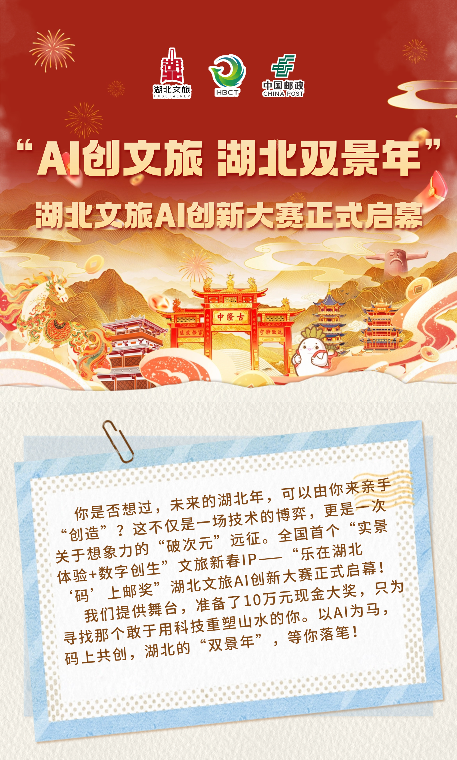 穿梭荊楚,讓想象力先抵未來(lái)!“樂(lè)在湖北‘碼’上郵獎(jiǎng)”AI創(chuàng)新大賽正式啟幕。湖北文旅集團(tuán)聯(lián)合湖北省郵政公司、湖北美術(shù)學(xué)院,于2月4日正式啟動(dòng)“樂(lè)在湖北‘碼’上郵獎(jiǎng)”AI創(chuàng)新大賽。本次大賽以“AI創(chuàng)文旅”為核心,面向社會(huì)廣泛征集運(yùn)用AI技術(shù)創(chuàng)作的、融合湖北文旅特色的數(shù)字作品,旨在以科技激發(fā)創(chuàng)意,展現(xiàn)荊楚文化魅力。參賽者需運(yùn)用AI工具進(jìn)行創(chuàng)作,作品需創(chuàng)意獨(dú)特,并能將AI技術(shù)與湖北的文化旅游元素有機(jī)結(jié)合。大賽征稿截止時(shí)間為2026年4月30日,參與者可通過(guò)“游湖北”H5頁(yè)面進(jìn)行線上投稿。